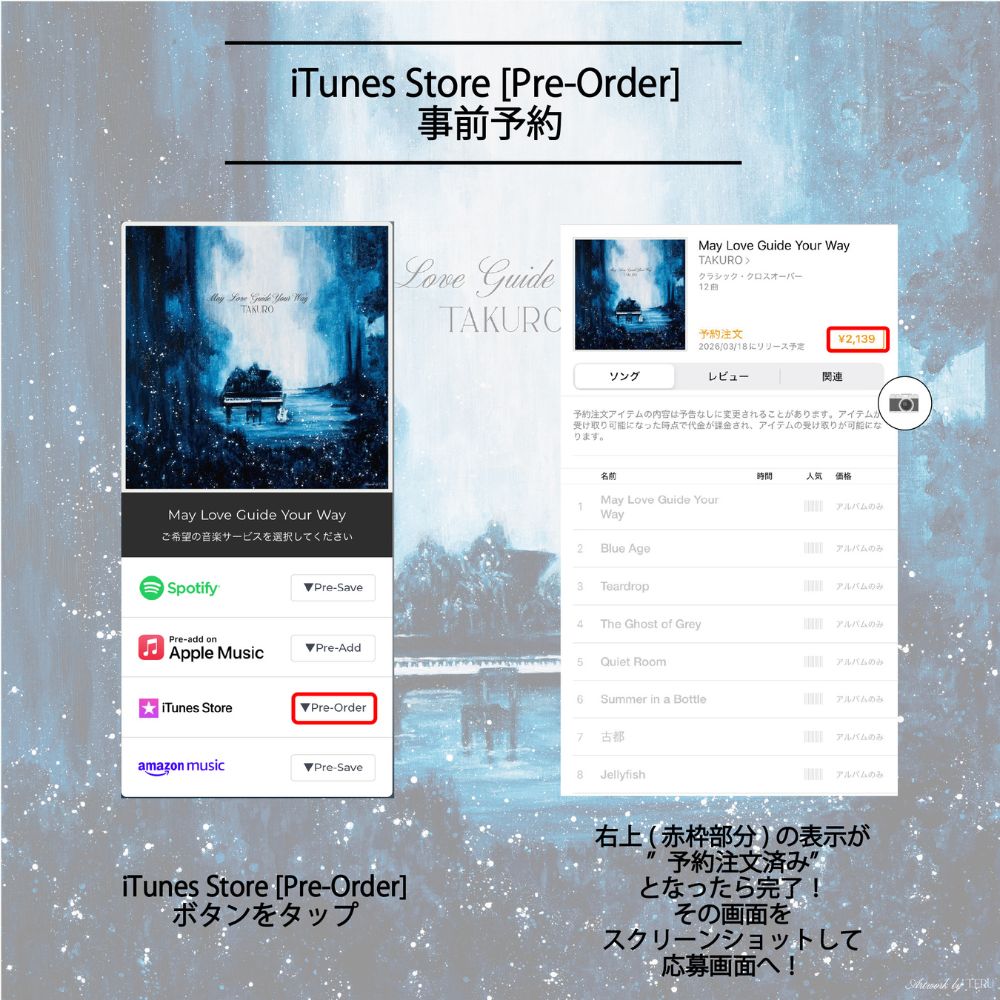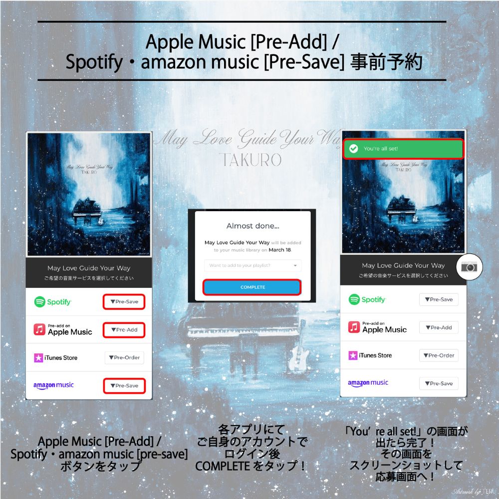 対象の音楽配信サービス(Spotify / Apple Music / iTunes Store / Amazon Music)で本作品を Pre-save / Pre-Add / Pre-Order(事前予約) (事前購入)し、応募フォームからご応募いただいた方全員にオリジナル待ち受け画像(PC用 / スマートフォン用) をプレゼントいたします。