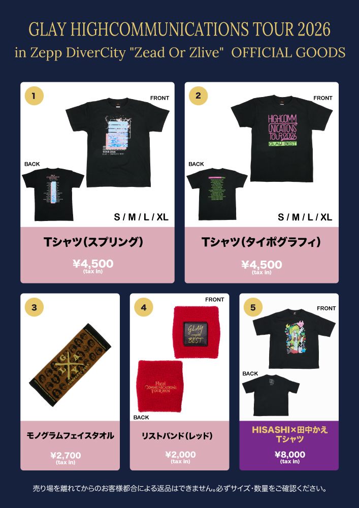3/17開催「GLAY HIGHCOMMUNICATIONS TOUR 2026 in Zepp DiverCity “Zead Or Zlive”」公演会場にて、ホールツアーグッズ(一部)の販売が決定!!