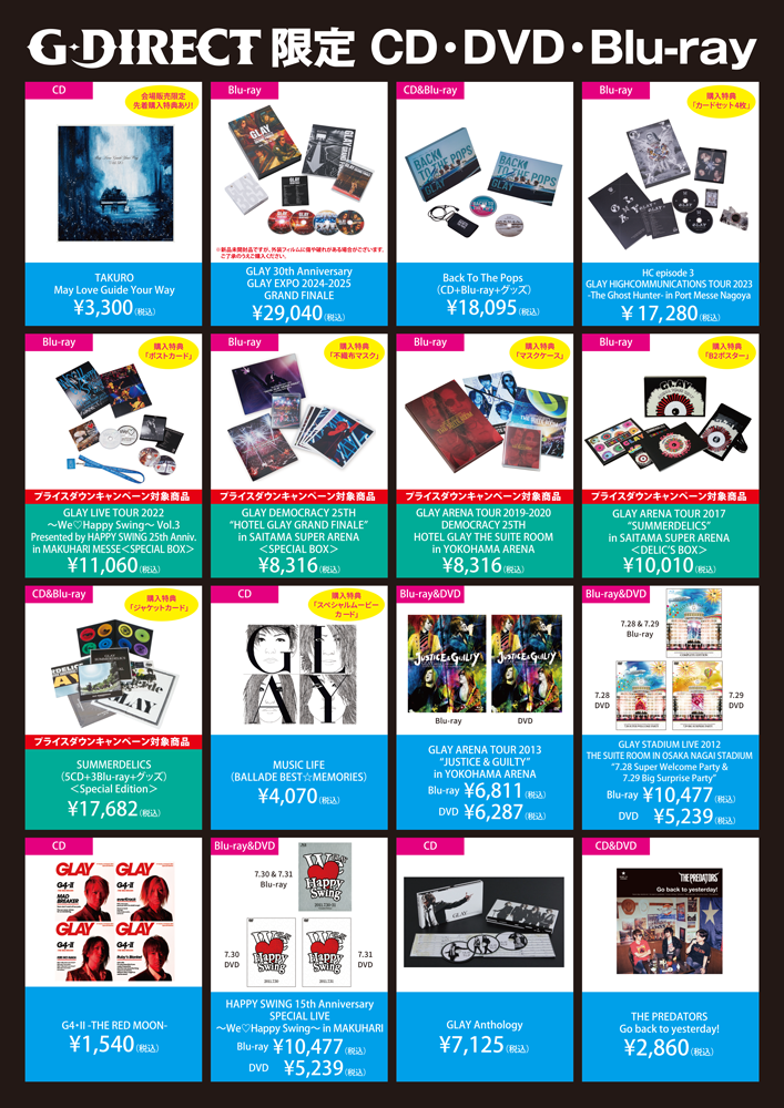 ※<Blu-ray>『GLAY 30th Anniversary GLAY EXPO 2024-2025 GRAND FINALE』(G-DIRECT限定盤)につきましては、新品未開封品ですが、外装フィルムに傷や破れがある場合がございます。ご了承のうえ、ご購入ください。
